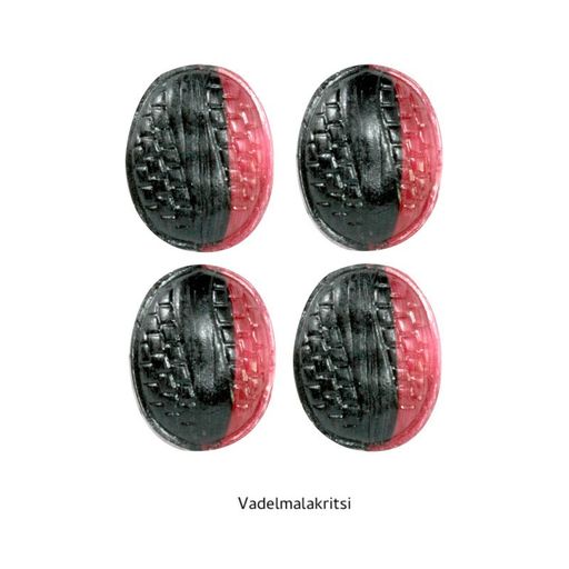 Ainesosat: Sokeri, glukoosisiirappi, aromit, väriaineet: E120, E153, anisöljy. Sisältää lakritsia, korkeasta verenpaineesta kärsivien tulisi välttää liiallista kulutusta. Ravintoarvo per 100 g: Energia 1652 kJ / 395 kcal. Rasva 0 g, -josta tyydyttyneitä rasvoja 0 g. Hiilihydraatit 97 g, -josta sokereita 97 g. Proteiini 0 g. Suola <0,1 g.