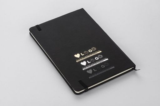 Tyylikäs A5-muistikirja, jossa on värikäs kuminauha ja nahkajäljitelmästä (PU) valmistettu kansi. Muistikirjassa on 80 ecrunväristä sivua, joissa on oranssit viivat.